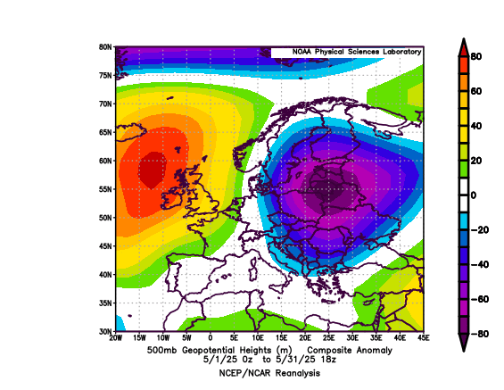 L'ultimo mese di primavera si presenta con un vero assaggio d'estate. Il promontorio anticiclonico africano spadroneggia sull'Europa occidentale, portando con sè masse caldissime per il periodo, con punte prossime ai +15°C a 850 hPa. Il 2 maggio si raggiungono i +29,7°C di massima, un valore tipicamente estivo.