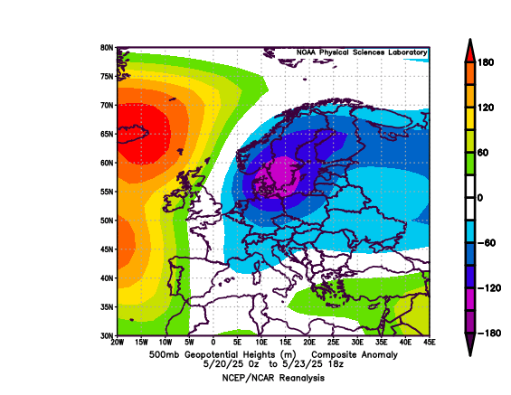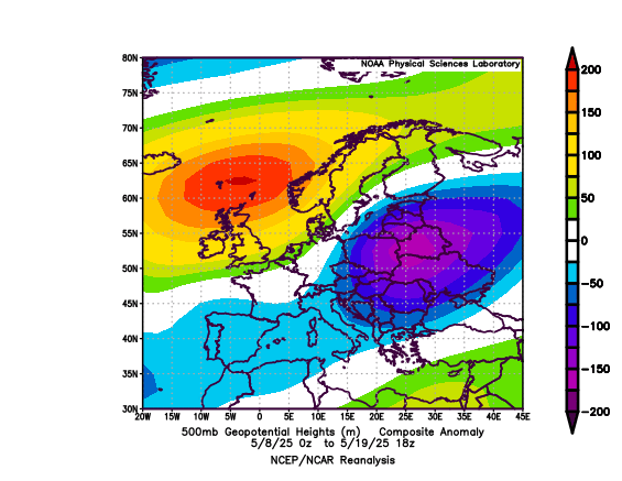 La situazione in corso non lasciava presagire nulla di buono, dal momento che, dopo la fase 8 della MJO, tipicamente fresca ma rivelatasi in questo caso rovente per la formazione della falla iberica e conseguente blocco a omega, occorrono le fasi "calde". Invece, con sorpresa anche dei modelli meteo, la MJO ha saltato queste fasi, ricomparendo verso la fine della prima decade in zona 5-6. La fase di inattività attraverso cui è dovuta passare ha determinato la formazione di gocce fredde, una delle quali si è presentata a ovest dell'Italia, determinando maltempo e crollo delle temperature al di sotto dei 20°C. Non si è trattato di un vero e proprio travaso di aria fredda, tuttavia, contrariamente a quanto accade nei mesi invernali, in maggio un grosso contributo alle temperature non è dato dalle masse in quota bensì dalla radiazione solare, dunque basta una rottura del tempo per passare da tepori tardo primaverili ad un freddo umido autunnale.