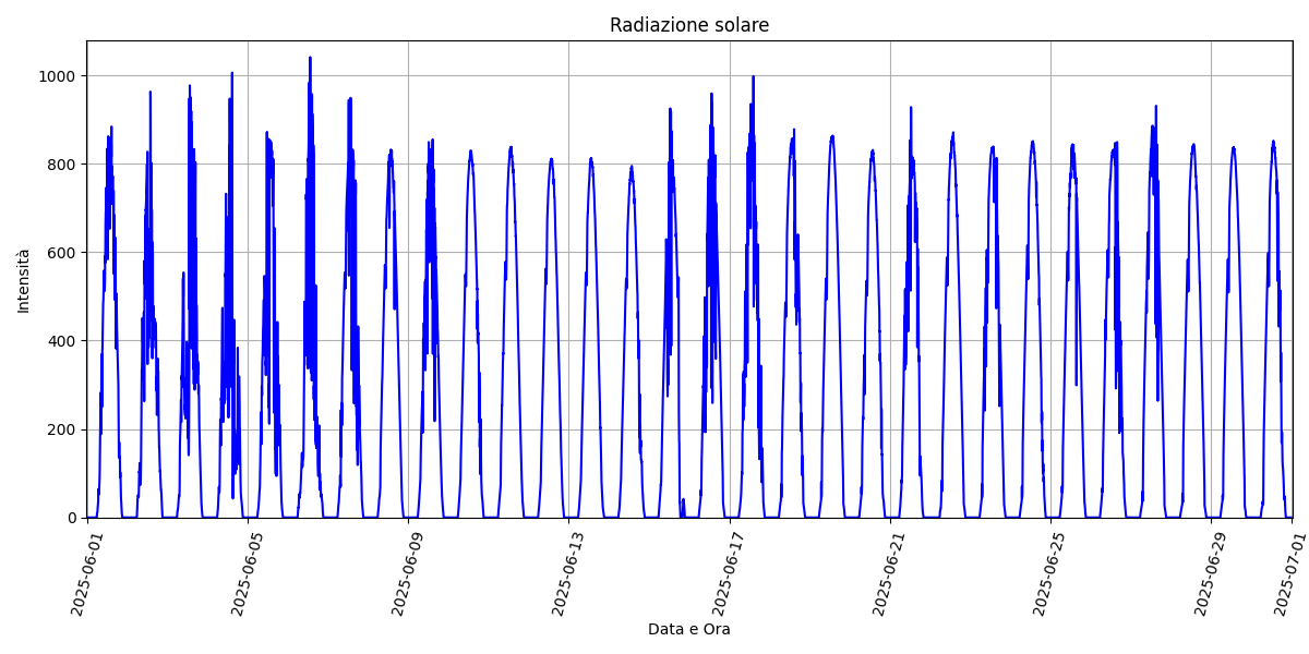 Il mese, dominato da condizioni stabili e soleggiate, conta mediamente 12,97 ore di sole giornaliere. Dal grafico sottostante, considerando le giornate senza nubi, ben evidenti in quanto la loro curva radiativa segue un profilo regolare, si nota un calo dell'intensità di picco e una riduzione di ampiezza progressivamente nelle giornate che vanno dal 10 al 14 giugno. Questo potrebbe essere dovuto all'interferenza delle particolato derivante dagli incendi canadesi, i cui effetti erano visibili sia da satellite che da occhio nudo, come testimoniano le due foto riportate. Il sole, difatti, appariva chiaramente schermato e osservabile ad occhio nudo senza difficoltà già diverse ore prima del tramonto.