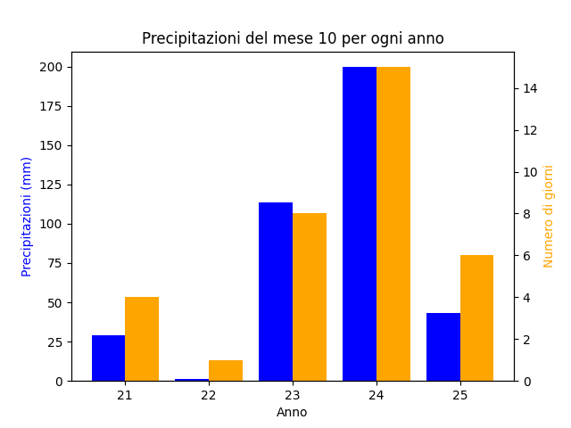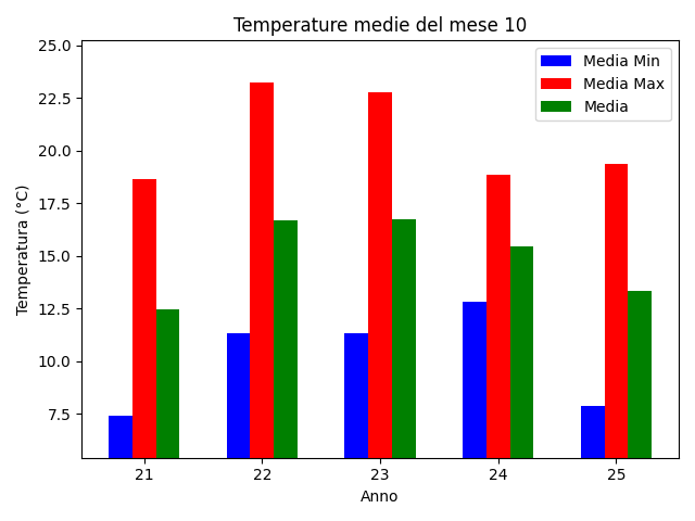 Ottobre 2025 è risultato fresco se paragonato agli ultimi anni: l'anomalia mensile ammonta difatti a soli +0,35°C (media +13,35°C). Fresche anche le massime (+19,38°C) ma soprattutto le minime (+7,86°C). La massima mensile viene registrata l'11 con +23,9°C e la minima il 27 con +2,5°C.
