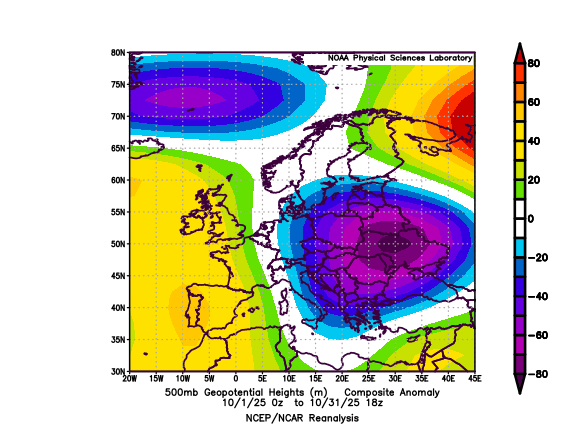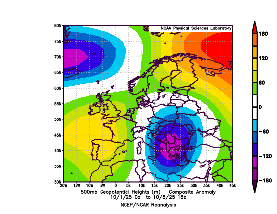 La dinamica osservata nell'ultima decade del mese è molto interessante per l'analisi del ruolo degli indici teleconnettivi. Già verso la fine della seconda decade, il calo della NAO su valori negativi (-1.5), associata ad una MJO in rapida progressione attraverso le fasi 2-3, favorisce un asse di saccatura in fasi 8-1, ma l'assetto della corrente a getto viene prontamente ridisegnato da un nuovo picco ampiamente positivo della PNA, la quale tende ad invertire il pattern proponendo quindi un asse speculari (in realtà 5-6 e non 4-5 perchè nel frattempo la MJO trasla in avanti di un'altra fase (con segnale peraltro intenso). Si noti infatti dalla gif che illustra la sequenza barica come la saccatura balcanica si colmi contemporaneamente allo sviluppo di una nuova onda sulla Gran Bretagna. Questo assetto comporta all'inizio della terza decade il coinvolgimento del Belpaese da parte di una prima ondata di maltempo. Altrettanto interessante è l'evidenza della positivizzazione della AO verso fine mese, la quale, seppur blanda, causa comunque un vistoso allargamento della saccatura ed una maggiore distensione del getto. Ciò si ripercuote sul nostro tempo provocando un'ombra pluviometrica ad est dell'arco alpino occidentale, con una fase asciutta a discapito della circolazione di bassa pressione, fase interrotta negli ultimi giorni di ottobre per merito di alcune onde minori che si inseriscono tipicamente in queste circolazioni di più ampio respiro.