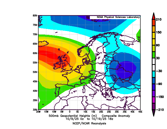 Vista la stazionarietà dei principali indici e coerentemente con la mia ipotesi, la risoluzione della fase fredda sarebbe da attribuire alla caduta della PNA, variabile la cui significativa positività (>+1) comportava l'inversione del pattern suggerito dalla sinergia fra gli indici AO, NAO e MJO. Alla fine della prima decade, venendo meno la forzante PNA, la suddetta combinazione favorisce l'asse dell'anticiclone proprio sull'Europa occidentale. Questo rinforzo ha portato le massime nuovamente al di sopra dei 20°C, ma la stagione oramai avanzata e la scarsa radiazione solare, nonchè la formazione di coriacee inversioni notturne favorite dal cielo sereno, hanno contrastato questo rialzo nelle minime, ed ai primi cedimenti dell'anticiclone anche i valori diurni hanno subito un brusco ridimensionamento.