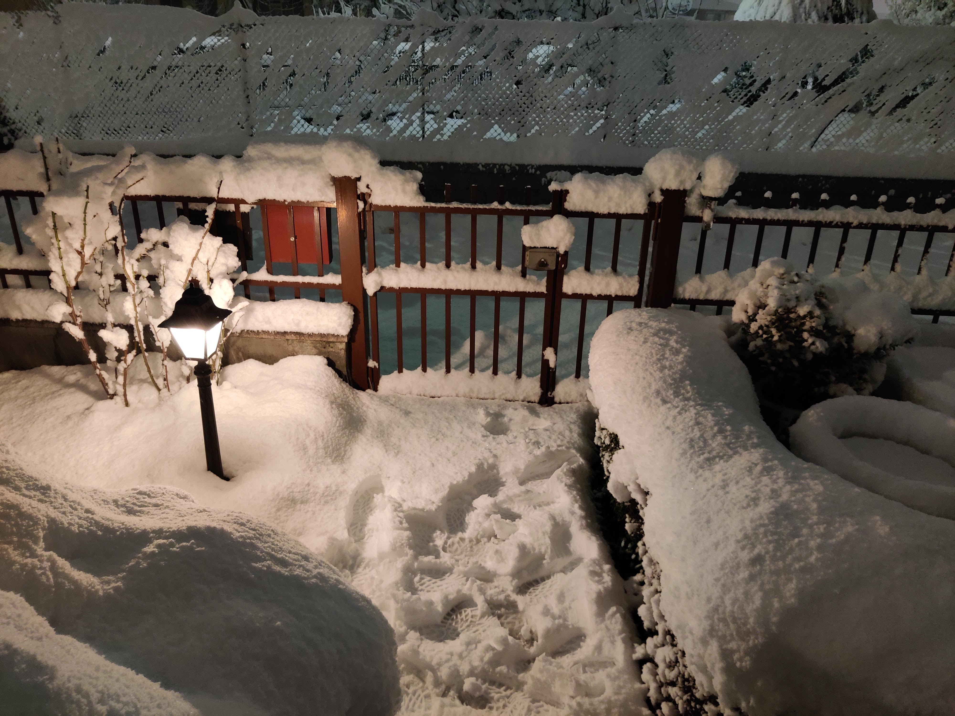 Di neve ce n'era, ce n'era eccome! Non 5, non 10, bensì 15 cm di neve candida e voluminosa, che grazie alle basse temperature aveva attaccato anche sulle superfici verticali sopravento, quelle rivolte proprio verso di me. Il cancello, i muretti, le colonne avevano tutti il loro bel cappello di neve, il palo del lampione era completamente imbiancato (nevicava con vento da est), e le reti di recinzione del giardino della casa di fronte era trasformata in una parete liscia e uniforme, il tutto splendidamente illuminato dalle illuminazioni e dalle luminarie. Era ancora notte, non una macchina o voce alcuna si sentiva, soltanto il rumore ovattato dei trattori impegnati a rimuovere un manto che cresceva a vista d'occhio. Il mio stradello, appena pulito, era già tutto bianco. Ricordo che nel momento in cui varcai l'uscio, all'impatto con quel paesaggio trasformato, un rapido flashback mi riportò indietro a quando ero bambino, a quando andavo a scuola in quegli anni nevosi munito di scarponcini e scarpe di ricambio in una borsa, mentre mia madre mi guardava dalla finestra. Dopo un attimo trascorso ad ammirare quella rara quanto preziosa vista andai a recuperare il metro per verificare quanta neve fosse caduta. La tavoletta era sommersa e si riverlò veramente troppo piccola (ma d'altra parte chi se l'aspettava una cosa del genere?!), ma fortunatamente la cassetta sui cui poggiava era stata coperta dalla neve, facendo così da superficie di appoggio maggiore. Ad ogni modo, grazie alla temperatura negativa e alla rapidità di accumulo potei utilizzare per verificare la misura anche i normalissimi muretti o i tetti delle auto. Verso le 7.00 i cm erano 15 se non ricordo male, ma mezz'ora dopo erano già 17! Dopo aver apprezzato quell'atmosfera natalizia, iniziai a fare foto, incurante del freddo e dei fiocchi che cadevano sul cellulare. Ne avrò fatte almeno un centinaio solo entro l'alba, mentre la nevicata continuava a crescere di intensità. L'apice si ebbe tra le 8.00 e le 8.30, quando accumulò a ritmi di olte 5 cm/h!!! Questa volta era davvero la nevicata del decennio! Ad un certo punto dovetti fare una pausa e rientrare perchè non mi sentivo più le mani, ma d'altronde sarebbe stato impossibile scattare foto con i guanti. Poi ripresi ed andai avanti e indietro per il quartiere per immortalare ogni singolo scorcio che per quell'attimo sfuggente si presentava agli occhi occhi con una veste tanto bella ed inconsueta. La stazione meteo era sepolta, ridotta ad un gigantesco pallone di neve sospeso. Pure sul suo palo, sebbene sia fatto in legno, i fiocchi erano riusciti ad attecchire. La dama bianca continuava imperterrita ad ammantare il paesaggio, il quale si illuminava sempre di più al giunger del giorno. La fitta fioccata non consentiva di vedere a più di 200 mt e ogni urlo, schiamazzo, rumore di pala o di spazzaneve era splendidamente ovattato dal sordo sottofondo della cascata di fiocchi. Non nevicava a larghe falde, ma come nevicava!! Il larice, i pini, tutti piegati dalla neve! Si "calma" verso le 9 per riprendere ad alta intensità circa un'ora dopo. Verso le 11.30 scendono gli ultimi fiocchi, che completano un magnifico quadro ammantato di una consistente coltre di 31 cm! E non è solo l'accumulo su tavola, no, sono 30 cm dappertutto, pure sulle strade laddove gli spazzaneve in grande affanno non sono riusciti ad arrivare.