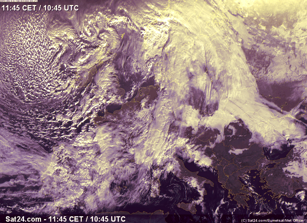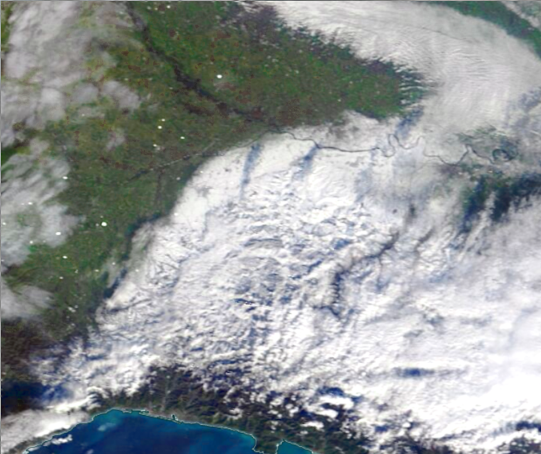 Domenica 8 gennaio, una tenace perturbazione atlantica piega la barriera anticiclonica erta a protezione del Mediterraneo, portando un sensibile peggioramento, nevoso dai 1000 mt sulle Alpi, ma soprattutto il tanto atteso sblocco della circolazione. L'immagine a corredo del paragrafo ritrae in tutto il suo splendore la spirale di nubi invorticate attorno all'area di bassa pressione centrata sull'Irlanda, ma soprattutto mostra la discesa meridiana dell'aria fredda, la cui traccia è disegnata quel "ciottolato" costituito da ammassi nuvolosi che si propaga dalle alte latitudini oceaniche fino alle coste settentrionali europee. Sull'Europa orientale spicca invece un altro ramo perturbato, il quale evidenzia la linea di contrasto tra il richiamo caldo prefrontale e l'avvezione gelida che ha investito la Russia alla fine della prima settimana di gennaio, con valori sensibilmente sotto le medie stagionali (che in quei luoghi sono fredde già di loro). Il transito della perturbazione è stato seguito da vivaci venti nord-occidentali, freddi in quota ma miti in pianura, che hanno provocato un provvidenziale ricambio d'aria e riportato il sole dopo tanto tempo. A dispetto della natura fredda della nuova massa d'aria, infatti, l'ostacolo alpino le ha conferito connotati favonici, tanto che martedì 10 con +15,1°C, il cielo limpido e l'arco alpino perfettamente visibile, sembra piena primavera. Già dalla sera, tuttavia, la graduale attenuazione delle correnti ha concesso un più drastico calo termico. Nei giorni seguenti, all'alba, la brina e l'aria frizzante ci ricordano che siamo a gennaio e al 45° parallelo, pur restando lungi dai canoni invernali. Ma, nel frattempo, dalla parte opposta dell'emisfero, un'ondulazione della jet-stream che ha provocato eventi alluvionali in California, si è propagata verso est, producendo di riflesso un'ondulazione secondaria che, nel giro di qualche giorno, ha spezzato la monotonia del tempo europeo, slanciandosi con impeto dall'Artico groenlandese verso l'Europa occidentale. Ad annunciare l'imminente peggioramento è la pioggia serale del 15 apportata da un passaggio prefrontale, mentre il dì seguente, nebbioso e con venti freddi nord-orientali, sembra preludere l'inizio di una fase dai connotati finalmente degni della stagione invernale.