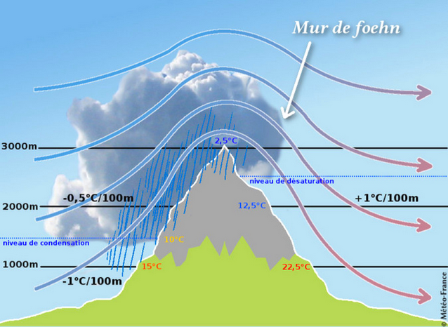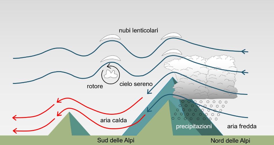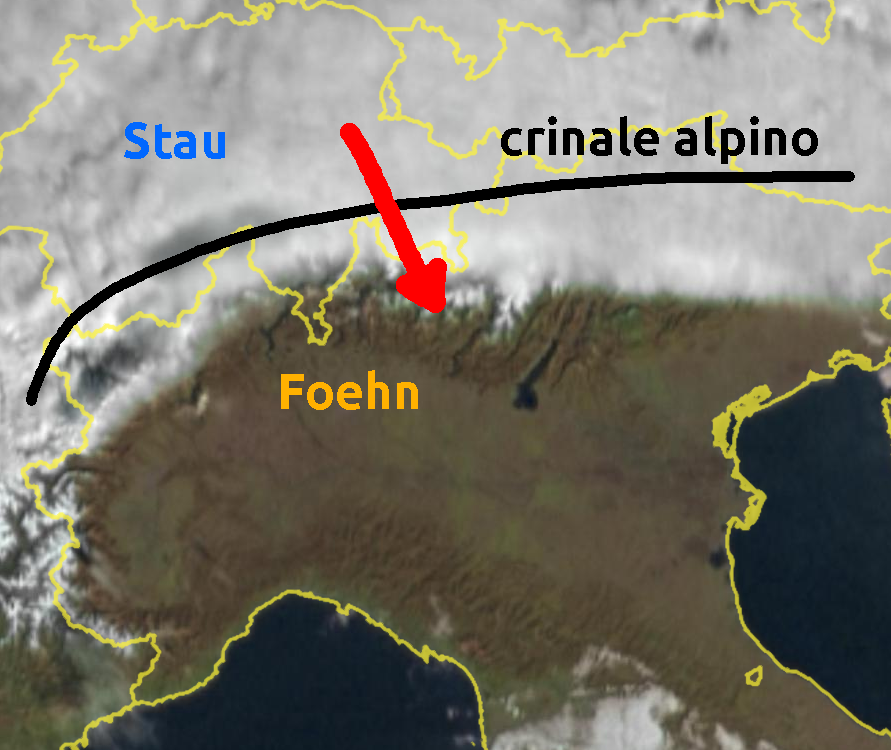 Il fenomeno del Foehn è in realtà strettamente correlato con quello dello stau: la massa d'aria che si sposta velocemente lungo un forte gradiente di pressione ed incontra una catena montuosa è costretta a scavalcarla, subendo così una trasformazione adiabatica: la massa d'aria sale lungo il versante sopravento incontrando pressioni via via minori (a causa della quota) e di conseguenza si espande, il che la porta a raffreddarsi come quando spruzziamo del deodorante fuori da una bomboletta sotto pressione. Se la barriera orografica è imponente, come nel caso delle Alpi, il raffreddamento è notevole e di conseguenza il punto di saturazione della massa d'aria, ovverosia il suo massimo contenuto di vapore acqueo allo stato gassoso, si abbassa fino ad eguagliare il contenuto di umidità effettivo della massa d'aria: in questo step avviene la condensazione in goccioline, che costituiscono le nubi. Se la massa d'aria è in partenza molto secca, la condensazione è insufficiente a generare precipitazioni, e di conseguenza una volta varcato il crinale la massa d'aria ridiscende lungo il versante sottovento, subendo la stessa trasformazione al contrario, in modo perfettamente simmetrico tra i due fianchi della catena. Ma se la massa d'aria è umida, allora si generano precipitazioni nel versante sopravento, e, una volta che la massa d'aria inizia a scendere verso l'Italia e subisce il processo inverso, smaltisce le goccioline d'acqua allo stato liquido prima, poichè parte del contenuto è stato scaricato tramite precipitazioni dal lato svizzero. La base delle nubi si attesterà quindi a quote asimmetriche fra i due versanti, e lungo la tale differenza di altitudine la caduta di vento produrrà un riscaldamento di 10°C/km sulla verticale. La compressione data dalla caduta produce inoltre un ulteriore riscaldamento in corrispodenza delle pedemontane, secondo il medesimo processo che regola gli anticicloni dinamici.
