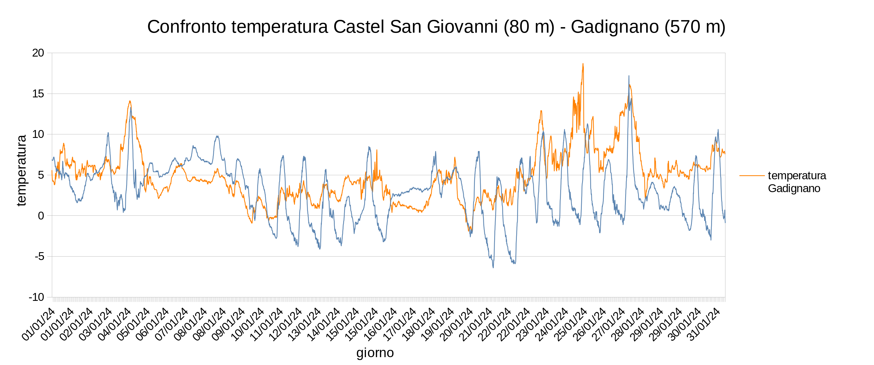 Per il terzo anno consecutivo, la prima settimana di gennaio trascorre mite, con nebbie e nubi basse. A seguire si è osservata parecchia dinamicità, ma con una circolazione atmosferica sempre poco favorevole a portare l'inverno a sud delle Alpi. A seguito della corposa perturbazione dell'Epifania, che ha accumulato 39 mm di pioggia e un po' di neve in alto Appennino, è entrata aria fredda da est responsabile del ritorno di gelate e galaverne, dopodichè una nuova irruzione fredda a metà mese è stata annientata dal richiamo mite di una perturbazione atlantica che ha arrecato altri fenomeni, e al cui seguito sono entrati nuovamente venti freddi da nord-est, con altre giornate rigide all'inizio della terza decade. Sul finire del mese, però, una ripartenza della zonalità associata ad un rinforzo del Vortice Polare è stata responsabile del ritorno dell'anticiclone subtropicale, con immediato e incipiente rialzo termico e successivo blocco atmosferico fino a fine mese. Questa situazione ha determinato l'accumulo di inquinanti in pianura padana, ma anche la formazione di nebbie e di un coriaceo strato inversionale che ha mantenuto le temperature prossime alle medie del periodo, mentre sui rilievi ha prevalso un anticipo di primavera. Si è chiuso così senza neve il mese notoriamente più freddo dell'anno, ma la nota di merito è che a fronte di un'anomalia termica positiva di +1,70°C (media mensile +3,00°C) le precipitazioni sono ammontate a 52,6 mm, con conseguente riempimento dell'invaso artificiale del Molato. Al cumulato hanno contribuito 5 giorni di pioggia, ma in piccola parte anche le brinate e le nebbie (frequenti 0,3 mm), e proprio le nebbie in particolare si sono presentate con insolita frequenza, ben 15 giorni, e addirittura per 65 ore consecutive tra il 27 e il 30. Gli estremi mensili, così come le sole 17 gelate, anche quest'anno riflettono un andamento di blando inverno, e segnano -6,4°C (21/01) e +17,3°C (27/01).