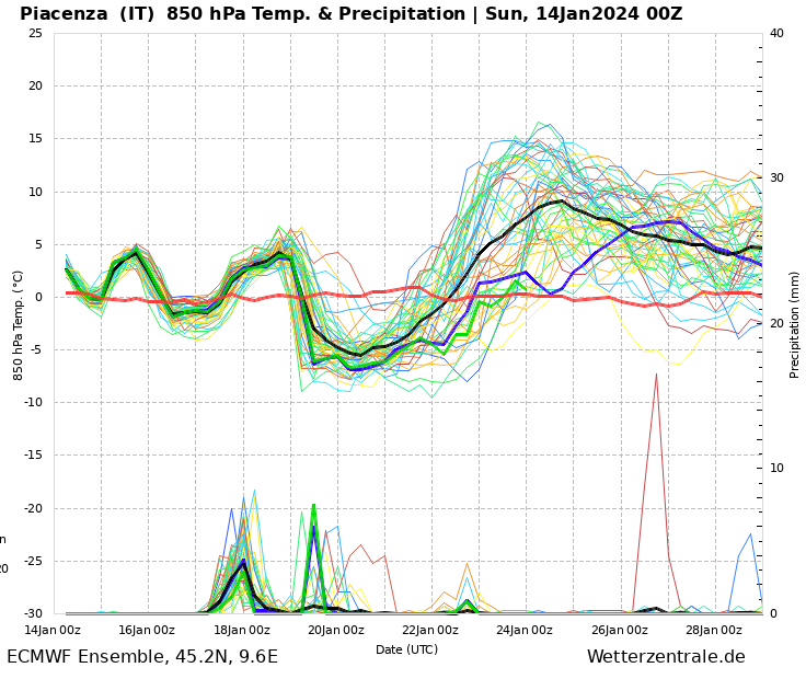 Il primo mese del 2024 esordisce con la forte zonalità ereditata dalla fine di dicembre, con tante nubi basse e nebbie, qualche nevicata sulle Alpi confinali e un quadro termico più tipico dell'autunno. Questo avvio zonale è sintomo di differenze di pressione molto accentuate tra alto e medio Atlantico; l'attenuazione di questo gradiente (inversione di segno della NAO) ha motivato una improvvisa ondulazione della corrente a getto sul finire della prima settimana di gennaio, ed una di queste ondulazioni, una saccatura seguita da aria polare-marittima, si è inserita dalla Valle del Rodano sul Mediterraneo, generando uno strutturato minimo di pressione che ha richiamato intensi venti meridionali sull'Italia. Il lento movimento di questo e la componente spiccatamente sud-orientale della ventilazione che ha accompagnato questo ciclone ha dispensato precipitazioni per molte ore su tutto il nord Italia, con accumuli abbondanti nelle zone soggette a stau, ovvero l'Emilia centro-orientale e la Brianza. Il graduale afflusso dell'aria più fresca sopracitata ha permesso anche un calo delle temperature in quota, dove, da sabato, è tornata a cadere la neve al di sopra dei 900 mt, con 20-30 cm di accumulo sulle principali vette della Val Tidone e Val Trebbia. Discorso diverso, invece, per la pianura, dove l'aumento della nuvolosità ha fiaccato lo strato inversionale, producendo un aumento termico. Sul finire della prima decade, tuttavia, la traslazione dell'area depressionaria verso levante ci ha esposti al richiamo di aria più fredda da est, grazie anche alla spinta verso nord dell'anticiclone delle Azzorre; il calo termico tuttavia fatica a propagarsi al suolo a causa delle nubi da stau indotte dai venti di Bora.