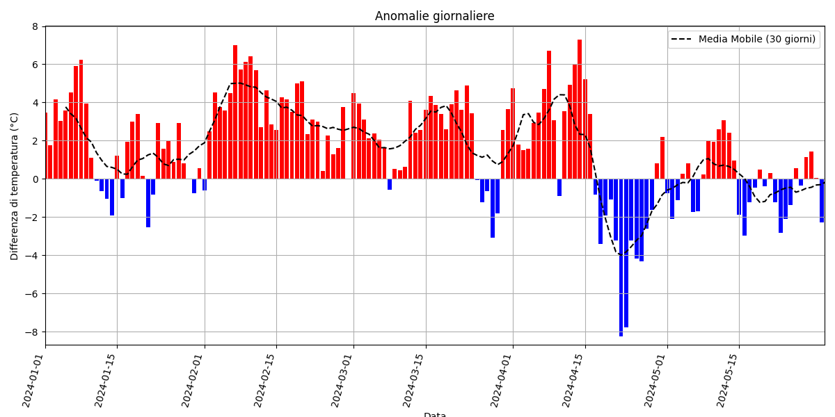 Tuttavia ricordiamoci che viviamo in un periodo sempre più caldo rispetto a quello che sono le medie di riferimento, e così un marzo che avrebbe dovuto risultare con un'anomalia debolmente positiva ha chiuso come molto caldo, un aprile potenzialmente nella norma ha fatto registrare un lieve scarto positivo, ed un maggio che sarebbe potuto essere molto freddo si è chiuso in realtà appena al di sotto della norma.