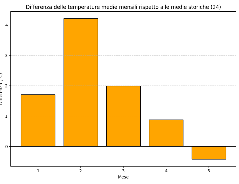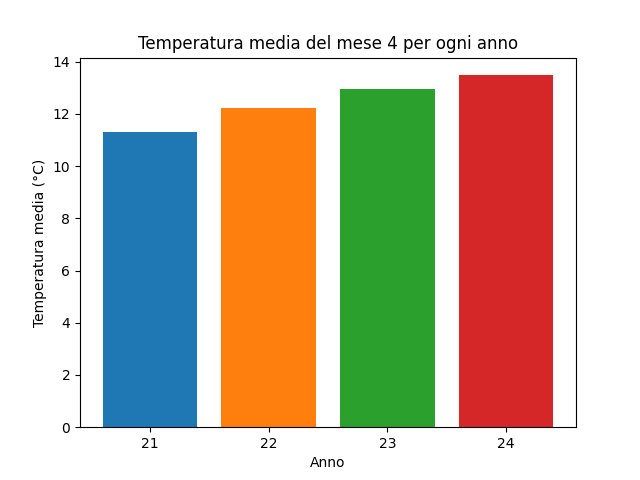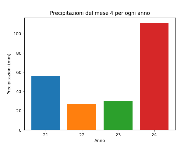 Sebbene a livello nazionale si è trattato di un mese avaro di piogge, ciò non si può dire per quanto riguarda buona parte delle regioni settentrionali. Le precipitazioni, sebbene circoscritte a poche giornate di pioggia (solo 6), sono risultate abbondanti e superiori alla media climatologica del mese. I 111,3 mm rilevati corrispondono quasi alla somma degli accumuli dei 3 mesi di aprile precedenti. Sotto l'aspetto termico, con uno scarto di +0,88°C, anche il secondo mese della primavera 2024 ha chiuso con una temperatura media superiore alla norma del clima 1986-2015, tuttavia occorre notare l'importante riduzione dell'anomalia rispetto al mese di marzo. Tale trend di attenuazione è ben visibile anche nell'andamento del mese, dove ad una prima metà dal sapore quasi estivo si è contrapposta una seconda parte quasi invernale, con due giornate in cui i valori massimi non hanno raggiunto i 10°C, con valori che non sono stati osservati neanche a marzo. Ciononostante, come emerge dal grafico, aprile 2024 risulta il più caldo degli ultimi quattro: questo perchè a dispetto dell'anomalia quasi trascurabile di questo mese, durante gli anni precedenti si sono osservate notevoli ondate di freddo in questo periodo, caratterizzate peraltro da gelate tardive che quest'anno non si sono verificate.