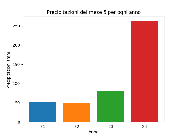 Di seguito ho proposto una serie di grafici che confrontano temperature e precipitazioni dei vari mesi delle ultime primavere, a partire dall'anno 2021. Si tenga conto che il triennio 2021-2023 è stato caratterizzato da precipitazioni generalmente molto scarse sulla nostra provincia, specialmente in primavera. Dalla fine di febbraio 2024 si è instaurato un pattern di stampo diametralmente opposto, contraddistinto da piogge frequenti e abbondanti. Questo radicale cambio di passo potrebbe quindi aver esacerbato il giudizio collettivo su questa stagione primaverile, per contrasto con quelle precedenti molto siccitose. Pertanto, successivamente procederemo a confrontare il dato di quest'anno con una serie storica un po' più corposa.