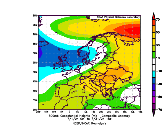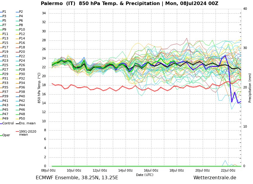 Gli effetti dell'innalzamento dell'ITCZ nella terza decade di giugno iniziano a farsi sentire anche sul comparto Mediterraneo: la fascia di anticicloni subtropicali avanza improvvisamente verso nord, inglobando tutti i paesi affacciati al Mare Nostrum, mentre va reiterandosi la circolazione depressionaria con perno sul Regno Unito. Fortunatamente, non si concretizzano affondi depressionari più ficcanti al largo della penisola iberica, e questo permette una maggiore distensione della corrente a getto, che riesce così a lambire appena le regioni di nord-ovest, mentre al centro-sud la situazione acquista nei giorni una certa gravità, come si vede dagli spaghi riferiti a Palermo, località che per tutta la seconda decade ha osservato temperature a +4/+8°C dalle medie storiche. Nella giornata di giovedì 11, l'isoterma di +20°C a 850 hPa raggiunge il nord Italia, ma è costretta a ripiegare nemmeno 24 ore dopo per l'inserimento di un fronte da ovest che permette lo sviluppo di due grosse supercelle, una sull'astigiano e l'altra sul milanese, con grandine di grosse dimensioni. In un contesto meteorologicamente non dissimile da quello di un anno fa, l'effimera rinfrescata si risolve con un'imminente rimonta calda, con minime tuttavia tendenzialmente più elevate e massime più contenute rispetto al luglio 2023. Ciò va imputato a terreni ancora molto umidi, che conferiscono all'aria immediatamente soprastante una maggiore inerzia termica. Non è un caso, difatti, che solo nella notte tra sabato 13 e domenica 14, in seguito all'ingresso di aria più secca, si sia finalmente registrata una minima notturna in linea con le medie del periodo e ben al di sotto dei +20°C. Il recupero è tuttavia lampante, tanto che la seguente ferma imposizione dell'anticiclone africano ne cancella gli effetti: per tutta la seconda metà del mese, sostanzialmente, si registrano ininterrottamente minime superiori ai +20°C e massime oltre i +32°C, con tassi di umidità elevati anche di giorno. La coda di qualche perturbazione produce fenomeni temporaleschi sull'alto Triveneto, mentre da noi arrivano al più le annesse sventagliate ventose, che non modificano sostanzialmente nulla, anzi puntellano le minime su valori ulteriormente elevati.