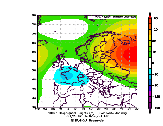 Dopo aver subito una battuta d'arresto in corrispondenza dell'Europa centrale, l'area di bassa pressione riprende a muoversi in senso retrogrado alla volta dell'Italia. Gli step tipici di un peggioramento sul nord Italia si ripetono ma con ordine inverso, una dinamica alquanto rara che vede dapprima inserirsi il vento da est in un secondo momento l'attivazione delle piogge da stau sull'Appennino. La situazione acquista particolare gravità in Romagna, dove a un anno di distanza dall'alluvione di maggio 2023 si verificano nuovi diffusi allagamenti, sia per accumuli molto importanti, sia per l'evidente e sconsiderata costrizione degli alvei fluviali. Da noi per 48 ore scende pioviggine intermittente, sufficiente comunque a fermare la temperatura massima di mercoledì 18 a soli +15,8°C. Un modesto rialzo termico si manifesta in avvio di terza decade, quando l'anticiclone scandinavo viene sostituito da una circolazione di bassa pressione, che, protendendosi verso l'area euro-mediterranea, porta una veloce quanto intensa perturbazione il 23, seguita dalla prima nebbia il 24. Sul finire del mese, le correnti piegano dai quadranti sud-occidentali, con venti favonici in caduta dall'Appennino che regalano tiepide giornate serene: un "arrivederci" dell'estate, prima di un altro deciso raffreddamento grazie all'umidificazione della massa d'aria secca.