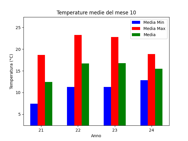Il riscontro termometrico rispecchia appieno queste dinamiche, con un leggero incremento termico nel corso del mese che si contrappone al tipico andamento decrescente del profilo termico di un mese autunnale, spostando così le anomalie positive a carico delle ultime due settimane. Il leggero raffreddamento degli ultimi giorni è da imputare all'instaurazione delle inversioni termiche, classica reazione del bacino padano a situazioni anticicloniche durante l'autunno e l'inverno. L'anomalia mensile di temperatura media ammonta a +2,41°C (media +15,41°C), ampiamente positiva ma inferiore a quelle eccezionali di ottobre 2022 e 2023. Un'analisi più approfondita permette comunque di distinguere fra massime normali e minime eccezionalmente elevate (ben 5 volte sopra i 15°C e per ben 26 oltre i 10°C), risultato abbastanza prevedibile in un contesto fortemente perturbato.