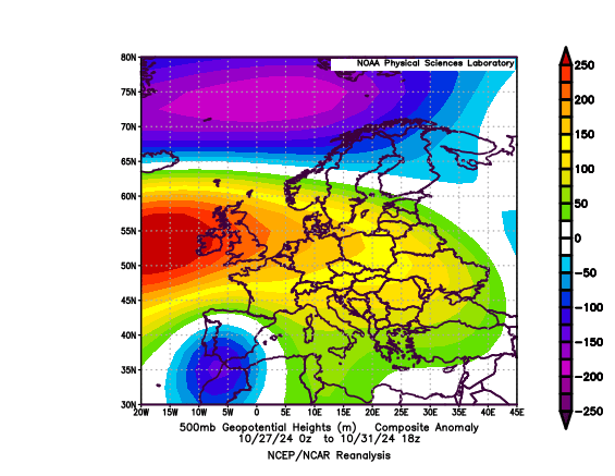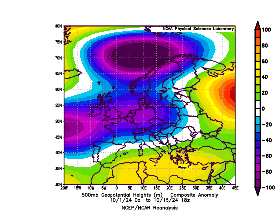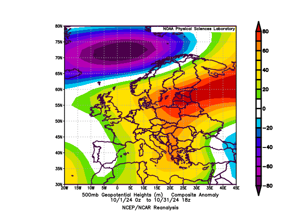 Il mese è stato caratterizzato da una prima fase contraddistinta da una circolazione moderatamente fredda e perturbata, ereditata dal mese di settembre, rimpiazzata poi nel corso della seconda decade da una situazione di forte e persistente maltempo, in condizioni più miti, compatibilmente con il passaggio da NAO moderatamente negativa a neutro-negativa associata alla formazione di un blocco sull'Europa orientale. Infine, si è concretizzata una parentesi anticiclonica, forse per merito di un rallentamento dell'AO che potrebbe aver giocato un ruolo nello spostamento del blocco anticiclonico sull'Europa centrale.