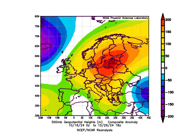 Il target per gli affondi depressionari resta il Mediterraneo occidentale, mentre sulla Russia europea permane un forte anticiclone di blocco che frena l'avanzamento verso est delle perturbazioni. Questa situazione esaspera il maltempo sull'Italia, ed in particolar modo sulle regioni del nord, dove si susseguono a breve distanza due importanti episodi perturbati: il primo, tra il 16 ed il 18 ottobre, porta un totale di 49 millimetri di pioggia, con accumuli generalmente maggiori verso nord e verso est; il secondo, invece, sopraggiunge tra sabato 19 e domenica 20, e l'impatto idraulico che ne consegue è figlio di una convergenza in sede padana tra la Tramontana in discesa da NNW e lo Scirocco in rientro da SE. Lungo una linea protesa da Ravenna a Piacenza si genera così una linea di rovesci e temporali, che portano localmente gli accumuli oltre i 100 mm. Si contano così nuovi danni in Emilia, in particolare a Bologna. Situazione ancora una volta più sotto controllo dalle nostre parti, dove l'accumulo sui 2 giorni ammonta a 47 mm. Nei giorni successivi si attua una breve e mite parentesi anticiclonica, ma da ovest si avvicina un nuovo ciclone che riporta piogge deboli per un'altra settimana, a dispetto del regime barico, che sulla carta è rigorosamente altopressorio. Le temperature minime restano su valori molto elevati, talora oltre i 15°C. L'ultimo peggioramento porta circa una trentina di millimetri e una forte riduzione dell'escursione termica giornaliera: le temperature massime si portano entro le medie della terza decade, ma di contro le minime subiscono un nuovo aumento, raggiungendo il 23/10 i +15,7°C.