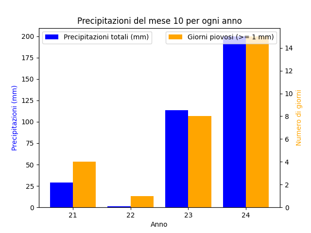 Le precipitazioni sono risultate le più abbondanti della serie storica, con un totale di 199,9 mm. La pioggia è caduta per ben 15 giorni su 31. Durante la seconda decade, la più piovosa, sono stati registrati 97 mm di accumulo, una cifra superiore all'intera media storica mensile.