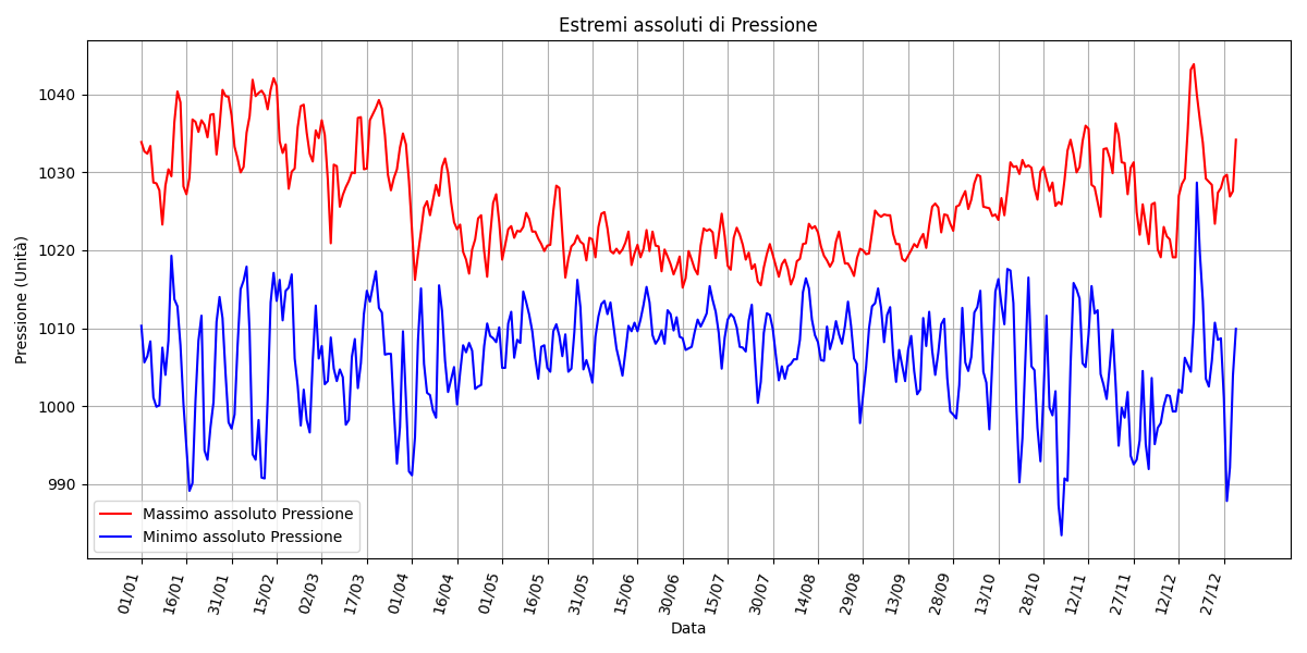 La pressione si mantiene pressochè costante durante l'arco dell'anno, con valori leggermenti più alti in inverno e poco più bassi in estate, a causa principalmente delle variazioni di densità dell'aria al suolo dovute alla conformazione padana che favorisce le inversioni termiche in inverno, creando un piccolo anticiclone. Ma le variazioni sono poco apprezzabili, ragion per cui ho preferito concentrarmi sul grafico degli estremi. Questo mette in luce un andamento che definirei a "clessidra coricata", con ampiezza maggiore nei mesi invernali e decisamente più contenuta in quelli estivi. Questo è devuto principlamente a due fattori: temperatura e circolazione generale. Le fasi anticicloniche invernali, a differenza di quelle estive, producono inversioni termiche al suolo, ma l'aria più fredda è anche più densa e quindi i valori di pressione possono risultare più elevati. Inoltre sono possibili avvezioni continentali, dove masse d'aria pellicolari presentano una densità molto maggiore in prossimità del suolo. Al contrario, d'estate non solo l'aria portata dalla circolazione dominante è più calda e umida e quindi meno densa, ma a questo va aggiunto l'effetto di subsidenza delle masse in Val Padana, che subiscono un notevole riscaldamento in prossimità del suolo, alleggerendosi notevolmente. Anche in presenza di anticicloni molto potensti alla quota di 500 hPa, di conseguenza, non sarà possibile raggiungere elevate pressioni al suolo. D'altro canto, l'estate è però anche quella stagione caratterizzata da un flusso perturbato debole e molto alto, con transito molto raro di depressioni in sede mediterranea. Questo, invece, può avvenire d'inverno, allorquando profondi vortici di bassa pressione possono causare dei sensibili tracolli barici. Aggiungiamoci che, nel periodo freddo, la tropopausa è mediamente più bassa, sempre per il discorso legato alla densità dell'aria, e questo costringe le masse a muoversi a più bassa quota, finendo per risentire molto di più dell'orografia. L'imponente barriera alpina acquista pertanto molto più valore durante l'inverno, rallentando il travaso e permettendo la creazione di differenze di pressione maggiori fra i due versanti della catena. Se la massa finisce per scavalcare l'arco Alpino, considerato uno spazio più limitato tra il top della troposfera ed il crinale alpino, si avranno velocità del vento maggiori. Questo per effetto Venturi, con conseguenti valori di pressione ulteriormente più bassi. Date queste condizioni, non è difficile scendere anche al di sotto dei 990 hPa, come avvenuto in diverse occasioni.