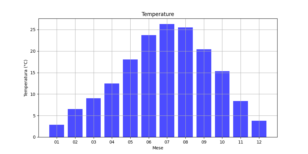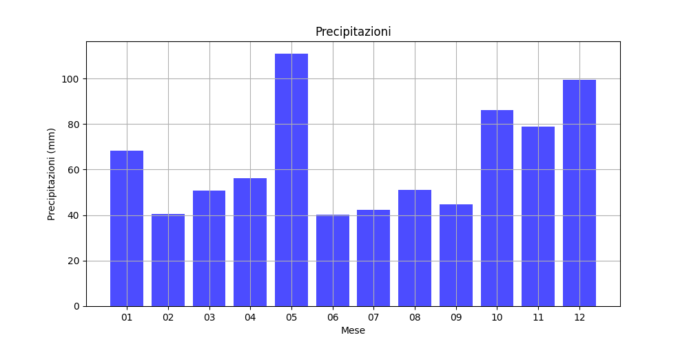 Anche il quadro termico presenta notevoli differenze fra un mese e l'altro, sintomo di una serie troppo corta. Anche i massimi precipitativi sono leggermente sbilanciati in avanti, cadendo in maggio e dicembre, piuttosto che in aprile e novembre. Sono comunque sufficientemente rappresentativi di un andamento bimodale, ovverosia caratterizzato da due picchi, uno in primavera ed uno in tardo autunno-inverno, e due minimi, uno in febbraio e l'altro a cavallo del trimestre estivo.