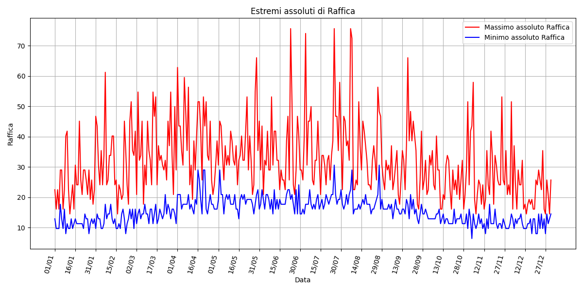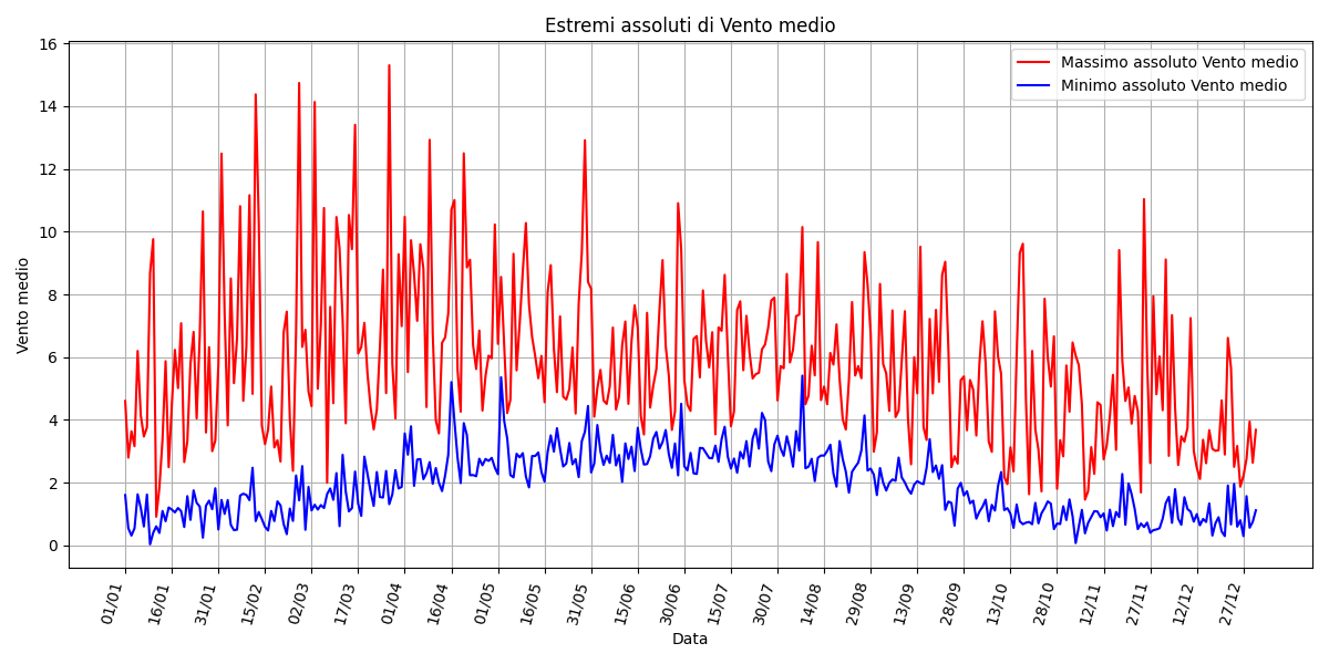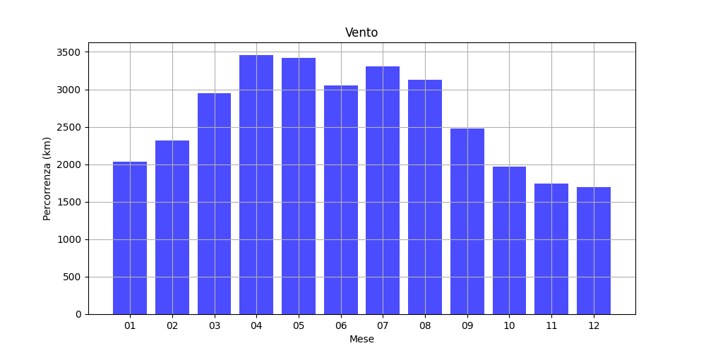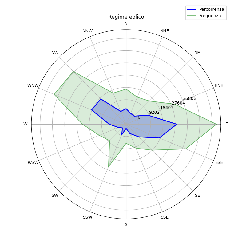 Il regime eolico mostra anch'esso un andamento bimodale: il massimo principale si ha tra aprile e maggio, quando la velocità media raggiunge i 4,79 km/h su base mensile (aprile). L'aumento di radiazione e i frequenti fronti freddi sono la probabile causa di ciò. Dopo un momentaneo calo in giugno, a luglio si incontra un nuovo massimo secondario (4,44 km/h), dovuto principalmente all'aria calda (più leggera) e ai forti temporali che talvolta si organizzano in dei veri e propri sistemi in grado di generare forti raffiche. Ironia della sorte, tutti e tre i mesi estivi annoverano una raffica record identica di 75,6 km/h. Gli estremi della raffica ci rivelano che non sono mai esistiti giorni con ventilazione completamente assente, quantomeno negli ultimi 4 anni, e nemmeno giorni con raffica inferiore a 5 km/h. A dispetto del fatto che le raffiche più intense si trovino quasi tutte nei mesi estivi, mediamente riscontriamo una maggiore densità di picchi ancora una volta nel periodo tardo invernale-primaverile, circa da febbraio ad aprile. Questo fenomeno si può spiegare con il grafico relativo agli estremi di velocità media su base giornaliera: i picchi più elevati, con velocità medie giornaliere fino a 15 km/h, si riscontrano tutti fra i medesimi mesi, tra febbraio e aprile, mentre con l'avvio della stagione calda si assiste ad un significativo ridimensionamento. Il confronto fra questi ultimi due grafici ci permette di capire, quindi, che mentre le raffiche primaverili sono effettivamente inserite in un contesto eolico vivace, quelle estive sono isolate e rappresentative per tanto di brevi folate inserite in giornate perlopiù tranquille. Dunque, mentre le raffiche primaverili sono prodotte direttamente dagli impianti circolatori che dominano il quadro atmosferico, quelle estive sono da imputare a fugaci fenomeni a microscala, ovvero i temporali, che sono in grado di provocare raffiche notevoli ma che riguardano una breve parentesi nell'arco della giornata, finendo per avere uno scarso peso sul bilancio eolico complessivo.