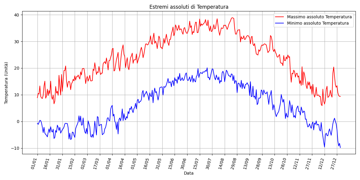 Passiamo ora al grafico relativo ai record giornalieri: in questo plot sono presenti, per ciascuna data, la temperatura massima e minima mai registrate. Supponendo che nella serie storica avessimo soltanto 2 anni, se il 14 aprile 2021 abbiamo registrato una minima di +0,3°C e il 14 aprile 2022 una di +2,2°C, il record per il 14 aprile spetta al 2021. Stessa cosa si fa per la massima di quella giornata, selezionando per confronto fra i vari anni quella più calda. E così via per tutti i 365 giorni dell'anno. Orbene, generalmente le serie di lungo periodo, come quella alberoniana, presentano una forbice molto più aperta nei mesi freddi, che poi va via via stringendosi in quelli caldi. Se, per esempio, per una qualunque data di luglio è probabile trovare un estremo minimo a +10°C e uno massimo a +35°C (circa 25°C di delta), per un giorno di gennaio non sarà difficile trovare un estremo minimo di -15°C corrisposto da uno massimo di +20°C (35°C di delta!). Questo nella mia recente serie non si vede perchè, come spiegato in un altro articolo, l'aumento delle temperature medie invernali ha provocato una significativa riduzione della variabilità termica stagionale. Si nota comunque una discreta ampiezza nei mesi primaverili, mentre un'escursione meno marcata interessa quelli autunnali, probabilmente come risultato del quadro igrometrico che esamineremo più avanti.
