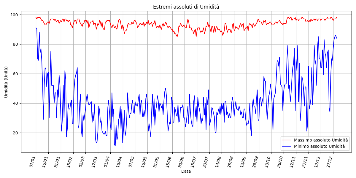 Dal grafico degli estremi, relativo all'umidità, si nota come i massimi restino sostanzialmente invariati nel corso dell'anno, con una lieve flessione durante il trimestre caldo che spiega la concomitante scomparsa delle nebbie notturne. La curva dei record di minima, invece, fa luce su un andamento ancora una volta interessante e che si spiega osservando le altre grandezze misurate: l'ampia forbice durante il periodo primaverile va a braccetto con la maggiore escursione termica vista nei grafici precedenti, così come i più bassi valori di umidità minima corrispondono anche alla maggiore ventilazione. I picchi più pronunciati, prossimi o inferiori al 20% di umidità relativa, si concentrano tutti tra febbraio e aprile, che, oltre a essere il periodo più ventoso dell'anno, è anche quello caratterizzato dalla quasi totalità delle irruzioni di Foehn. Anche le precipitazioni lasciano la loro traccia sul parametro igrometrico: l'autunno, caratterizzato in prevalenza da fronti calde e quindi da piogge deboli e prolungate, assiste a una copertura nuvolosa maggiore, una minore ventilazione (anche a causa della minor radiazione solare) e quindi a valori di umidità minima che restano piuttosto elevati rispetto al resto dell'anno.