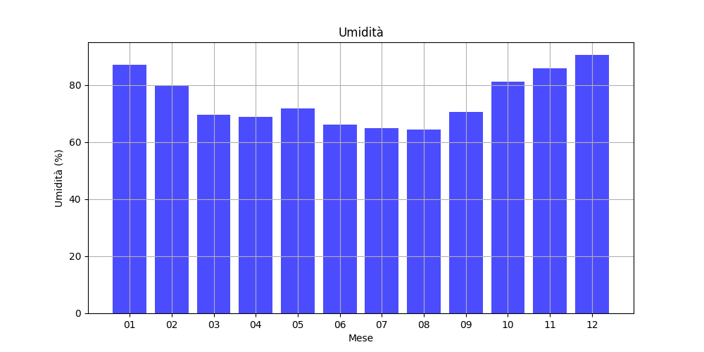 L'andamento del profilo igrometrico è il risultato di vento e precipitazioni: il primo rimescola l'aria nei bassi strati, asciugando gli ultimi metri di colonna e la superficie del suolo, mentre le piogge al contrario favoriscono l'umidificazione anche grazie all'azione bloccante delle nubi nei confronti della radiazione solare. Il profilo è comunque in prevalenza influenzato dall'eliofania annuale, con il minimo a ridosso del periodo estivo, quando i valori medi di umidità rasentano il 60%, ed il massimo durante il periodo tra novembre e gennaio, allorchè si può sfiorare o superare il 90% come media. Il ruolo delle precipitazioni è evidente soprattutto durante maggio, quando si incontra un isolato massimo relativo attestato poco sopra al 70%.