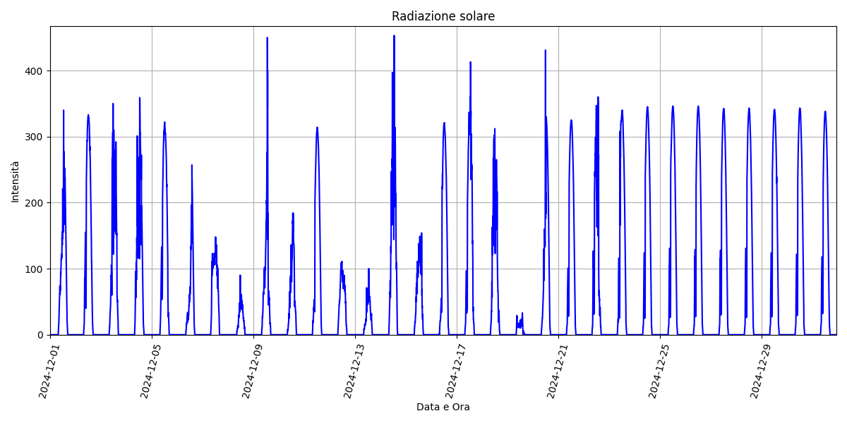 L'eliofania media giornaliera del mese più buio dell'anno questa volta non risulta particolarmente contenuta. Difatti, grazie all'elevato numero di giorni soleggiati, la cifra tocca le 7,40 ore giornaliere, appena inferiore a novembre. Dal grafico di dettaglio si notato le fasi con tempo perturbato, tuttavia sono scarse le giornate nebbiose ed il minimo radiativo annuo (solsitizio) è stato parzialmente mascherato dall'atmosfera cristallina regalata dalla parentesi favonica, con massima diffusione della radiazione solare in atmosfera