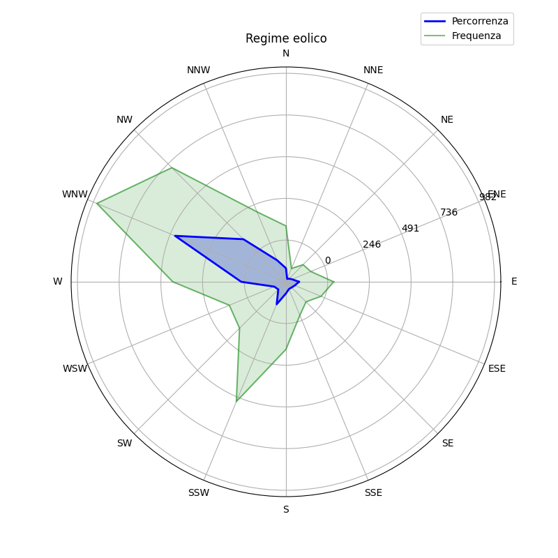 La distribuzione del regime eolico rispecchia perfettamente un mese spiccatamente anticiclonico: prevalgono in frequenza i venti da WNW e le brezze di monte da SSW, mentre risulta quasi del tutto assente la componente orientale.