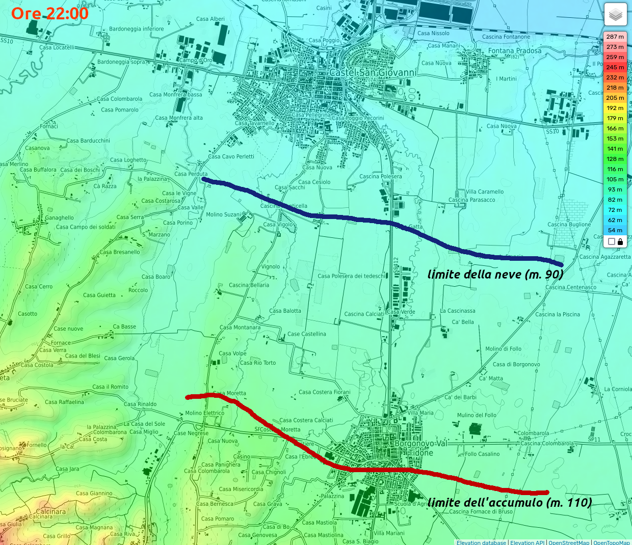 Sebbene, specie negli ultimi (caldi) anni, la componente altimetrica abbia acquisito un ruolo determinante in sempre più circostanze nevose, nello specifico caso della nevicata che stiamo analizzando c'entra ben poco. Fra la parte alta di Castel San Giovanni e la rocca di Borgonovo Val Tidone intercorrono poco più di 30 metri di dislivello, l'equivalente di un palazzo di 8 piani. È pertanto molto inverosimile che questa differenza possa aver avuto un ruolo così sostanziale nella collocazione di una quota neve, e soprattutto che, mentre in una pioveva con qualche fiocco fradicio, nell'altra nevicava copiosamente con accumulo. È altrettanto fantasioso, anche ammesso un limite così netto, credere che esso possa essere rimasto stabile per così tanto tempo.
