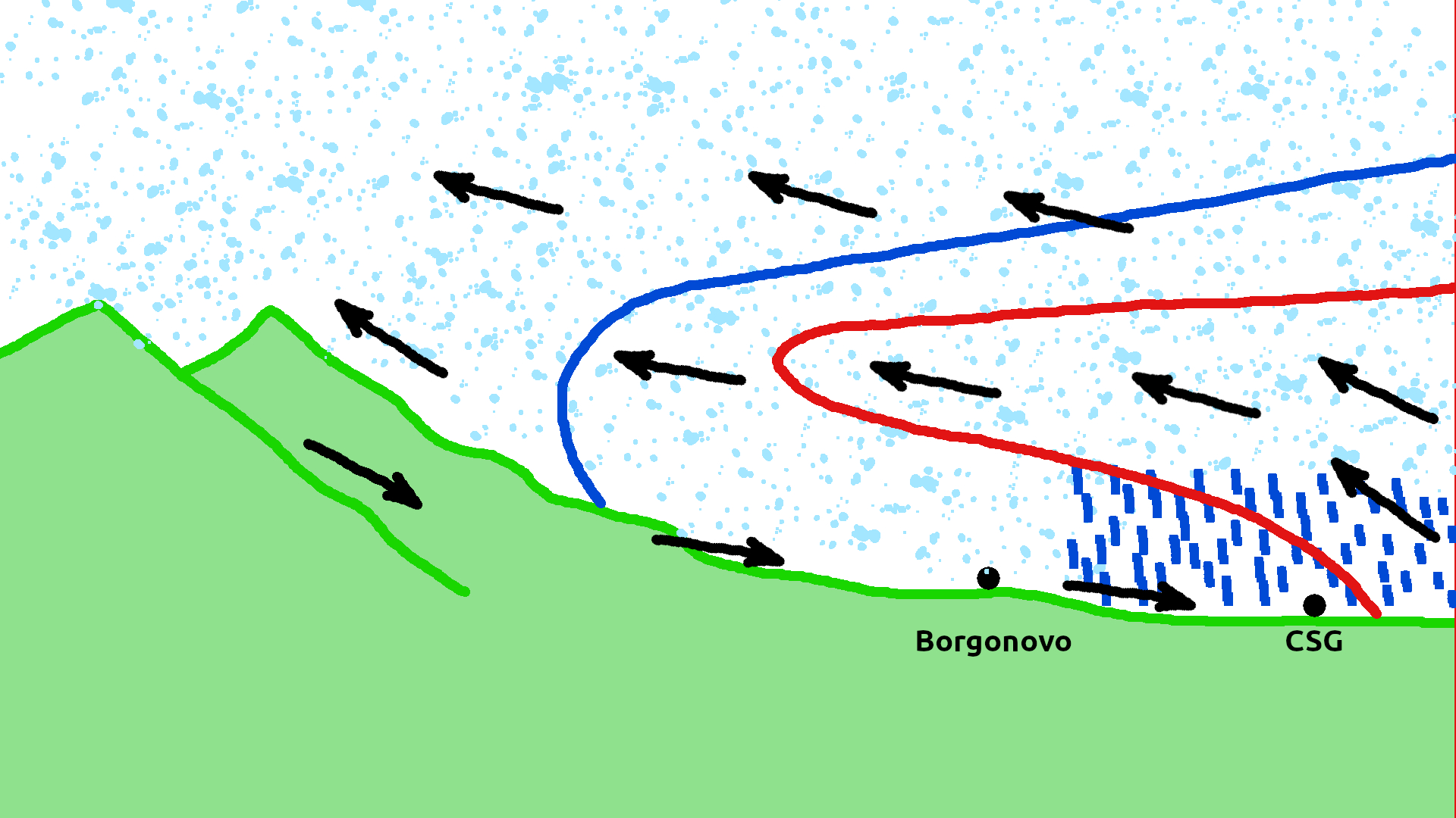 Resta da chiarire il motivo per cui, invece, si passava a neve asciutta a pochi chilometri di distanza, a parità di quota. La ragione è da ricercare nello spessore dello strato di aria calda inseritosi a quote medio-basse: procedendo verso l'Appennino, lo spessore della massa d'aria fredda in uscita dalle valli aumenta, a discapito dello spessore dello strato tiepido, inoltre si risente maggiormente dell'ostacolo costituito dalla catena appenninica. Questa si pone trasversalmente rispetto ai venti da NE, costringendoli ad una risalita (visibile anche dalla carta del modello Icon, dove la riduzione di velocità si spiega con una verticalizzazione dei vettori del vento) che ne forza così:
