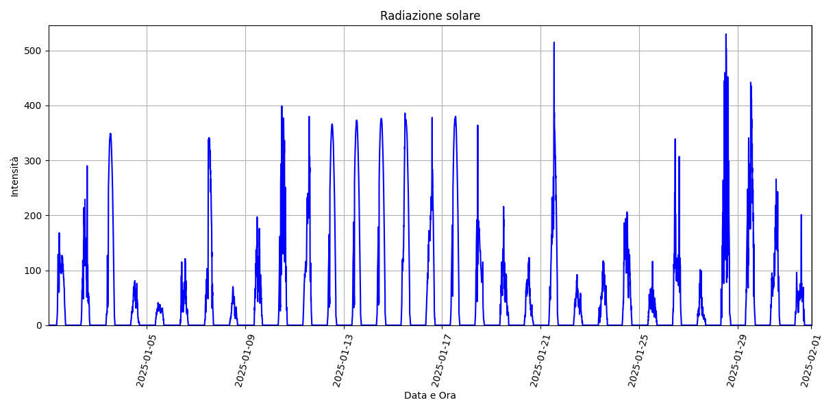 La radiazione solare presenta due periodi depressi, corrispondenti alla prima e alla terza decade, quando hanno prevalso situazioni perturbate, mentre più lineare è l'andamento della seconda decade, caratterizzata da giornate fredde ma serene. La media è di 8,58 ore di luce giornaliere.