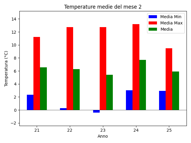 L'assenza di prolungate fasi fredde ha determinato un mese complessivamente più mite della media storica di riferimento (1986-2015) di +2,42°C (media rilevata di +5,92°C). Febbraio 2025 si è chiuso quindi come molto mite, nonostante sia il 2° più freddo degli ultimi 5 anni, dietro al 2023, e a dispetto dell'assenza di giornate particolarmente calde. Questo è tuttavia un altro effetto del riscaldamento intenso subito da questo mese, la cui variabilità si è andata appiattendo, come descritto in questo articolo.