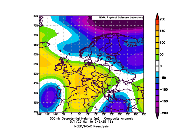L'ultimo mese di primavera si presenta con un vero assaggio d'estate. Il promontorio anticiclonico africano spadroneggia sull'Europa occidentale, portando con sè masse caldissime per il periodo, con punte prossime ai +15°C a 850 hPa. Il 2 maggio si raggiungono i +29,7°C di massima, un valore tipicamente estivo.
