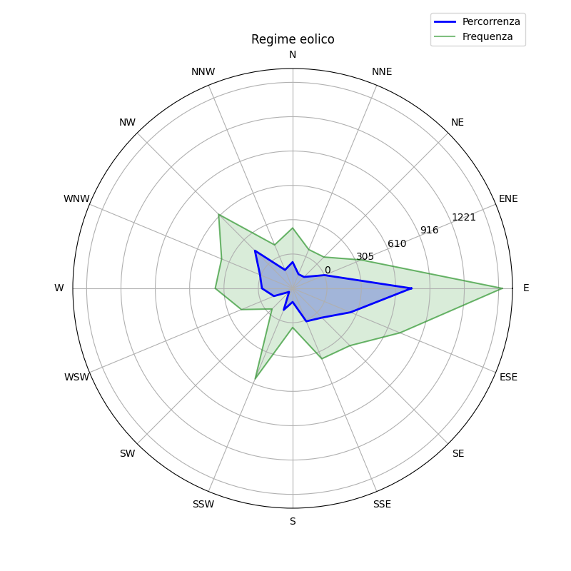 Il quadro eolico mostra molteplici affinità con il mese precedente. Anzitutto si nota una spiccata prevalenza dell'E, dovuto a Scirocco e infiltrazioni fresche durante gli scambi meridiani, quindi abbiamo già indizi di un mese fresco. Il NW si piazza ancora al secondo posto, come frutto di correnti mattutine in condizioni anticicloniche, ben presenti in questo mese. Infine, risaltano le brezze di monte e di valle, rispettivamente da SSW e N. Modesta la raffica mensile, solo 37,0 km/h.