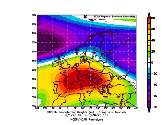 La situazione cambia con l'arrivo della seconda decade, a causa del concomitante rallentamento della zonalità e passaggio della MJO attraverso le fasi 1-2. Complice una rinnovata presenza della famigerata falla iberica, una figura di bassa pressione che sta arroventando le estati mediterranee del nuovo millennio, sull'Italia viene richiamato il promontorio anticiclonico nordafricano, a dispetto di un ITCZ ancora basso sul centro Africa. Le correnti meridionali convogliate dalla struttura ciclonica non si limitano a rendere caldissime le giornate più lunghe dell'anno, ma apportano un'atmosfera caliginosa, torbida. Durante i giorni che precedono la metà del mese risulta difficile da qui scorgere l'Appennino, il che si traduce in una visibilità inferiore ai 40 km in campo aperto. Ciò non è dovuto al trasporto di sabbia dal Sahara, bensì a imponenti roghi che insistono da settimane sul Canada, i cui fumi caldi creano dei pirocumulonembi che iniettano le polveri in stratosfera, dove vengono prese in carico dalla corrente a getto, che attraverso un sinuoso percorso le conduce sull'Europa. Qui, la compressione anticiclonica le introduce nel bacino padano, che si offusca: il 13 giugno, difatti, si raggiungono diffusamente concentrazioni di polveri sottili superiori a 50 microgrammi su metro cubo, una soglia considerata di pericolo, ma questa volta l'inquinamento antropico c'entra ben poco. Uno strappo nella corrente a getto interviene a ripulire i nostri cieli soltanto il 15 giugno, sollevando il "coperchio" che ostacola la convezione e dando vita così a un sistema temporalesco che corre lungo l'asse del Po in serata. Alle 18.30 sopraggiunge il forte temporale, e in poco più di un'ora cadono 45 mm di pioggia (con intensità fino a 225 mm/h), accompagnati da grandine piccola, tanti fulmini e raffiche fino a 61 km/h. La rinfrescata si rivela effimera, insufficiente persino a rientrare in media, e con l'avvio della terza decade si imposta un nuovo anticiclone, questa volta fortissimo ed esteso dal Magreb a tutta l'Europa occidentale. Sebbene le correnti siano di estrazione oceanica, la fortissima compressione adiabatica cui sono sottoposte le rende caldissime, portando ad infrangere ripetutamente la soglia dei 40°C sull'entroterra spagnolo e sulle pianure francesi, evento un tempo inimmaginabile ma ora sempre più frequente. Il cuore dell'anticiclone si colloca proprio a ridosso del nord Italia, con la superficie isobarica di 500 hPa, normalmente collocata attorno ai 5500 metri di quota, che vola a 5960 metri! Questo comporta, tra il 28 e il 29 giugno, il superamento dei 5000 metri da parte dello zero termico, con il Monte Bianco che registra temperature superiori a 0°C fino in vetta, evento molto raro. Verso la fine del mese si registrano quotidianamente minime tropicali e massime superiori a 35°C, con il picco di +37,2°C il 30 giugno, giornata in cui si sfiorano i 30°C di media giornaliera.
