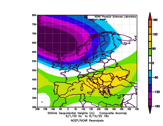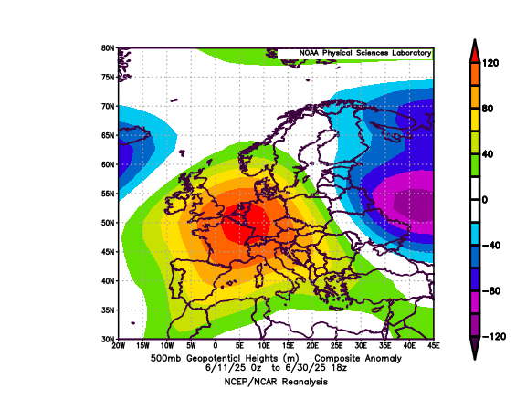 L'avvio, segnato dalle fasi 6-7 della MJO, ha visto un asse di saccatura proteso verso il nord-est italiano, grazie anche alla spinta verso levante di una ritrovata zonalità. Con la fine della prima decade, però, la caduta dell'AO e lo smorzamento della MJO hanno favorito una configurazione bloccata e la formazione dello spontaneo scambio meridiano a ridosso della penisola iberica, con l'approfondimento di una depressione a ovest e la risposta anticiclonica e calda ad est. L'insistenza di questo schema, che dall'11 al 30 non ha visto alcuna interruzione, ha tenuto sotto scacco l'Europa occidentale, rinnovando condizioni di caldo anomalo, con una persistenza da record. Queste due situazioni sono ben riassunte dalle carte delle anomalie di geopotenziale qui presenti.