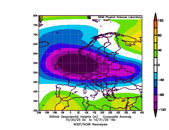 Vista la stazionarietà dei principali indici e coerentemente con la mia ipotesi, la risoluzione della fase fredda sarebbe da attribuire alla caduta della PNA, variabile la cui significativa positività (>+1) comportava l'inversione del pattern suggerito dalla sinergia fra gli indici AO, NAO e MJO. Alla fine della prima decade, venendo meno la forzante PNA, la suddetta combinazione favorisce l'asse dell'anticiclone proprio sull'Europa occidentale. Questo rinforzo ha portato le massime nuovamente al di sopra dei 20°C, ma la stagione oramai avanzata e la scarsa radiazione solare, nonchè la formazione di coriacee inversioni notturne favorite dal cielo sereno, hanno contrastato questo rialzo nelle minime, ed ai primi cedimenti dell'anticiclone anche i valori diurni hanno subito un brusco ridimensionamento.