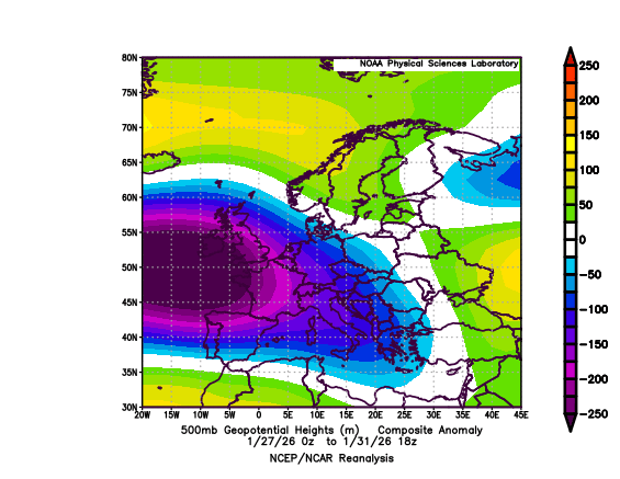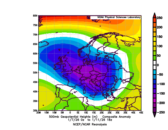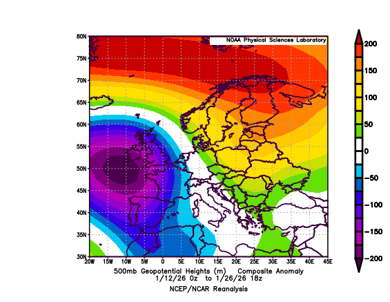 La prima settimana di gennaio esordisce con condizioni favorevolissime al gelo sull'Italia. In un contesto di instabilità generale del VP lungo tutta la verticale, l'accoppiata AO-/NAO- provoca una significativa frenata zonale sul comparto euro-atlantico, e grazie ad una MJO in fase 6-7 si sviluppa una saccatura con asse leggermente retrogrado protratto dal Mare di Kara alla Penisola Iberica. L'unico difetto sta nel crollo di intensità della MJO, che toglie stabilità all'onda ciclonica in Atlantico, impedendo il trasporto di calore verso il VP nel momento più propizio. La retrogressione, quindi, sfocia come di consueto in oceano, riattivando una zonalità bassa che investe il nostro paese. L'impeto di tale ripartenza favorisce il transito di una perturbazione molto veloce che lascia in ombra quasi tutto il nord Italia ad eccezione dell'Emilia-Romagna orientale e del Triveneto, dove si verifica l'unica significativa nevicata dell'inverno fino in pianura. In linea con il classico copione, questa dinamica evolve con un abbassamento della pressione in Atlantico e la rimonta di una gobba subtropicale sull'Iberia, corrisposta da un'ondulazione ciclonica sui Balcani, con l'Italia situata nel mezzo ed esposta ad una veloce discesa di aria fredda da NW con carattere favonico sulla Pianura Padana occidentale, e primo superamento della soglia dei 10°C (di poco) in un contesto molto secco. A differenza degli inverni passati, seguendo anzi un pattern più simile all'inverno 2024-25, questo tentativo fallito di destabilizzazione non viene compensato da un riaccorpamento del VP, ma restano le condizioni per nuove iniziative: in coerenza con questa lassità del vortice il flusso resta basso e teso, e il promontorio subtropicale trasla verso est, esponendo di nuovo l'ovest Europa a correnti con curvatura ciclonica. Un nuovo tentato blocco si organizza così sulla Russia europea, con evoluzione del promontorio a pattern scand+, ma emerge che ciò non basta a portare il freddo sull'Italia: questo perchè il blocco, sebbene in posizione più favorevole rispetto ai precedenti, è evoluto a partire da una radice non atlantica bensì molto più orientale, e questo ha fatto sì che le prime correnti a raggiungerci non siano state quelle orientali ma quelle oceaniche miti. Il blocco ha poi seguito la classica evoluzione verso nord-ovest, con allaccio fra le due correnti a latitudini troppo elevate per un nostro coinvolgimento diretto da parte del freddo, anzi, ancora una volta abbiamo assistito a un tempo perturbato dovuto a un nuovo slancio del getto basso. Gli effetti dell'evoluzione del blocco verso nord-ovest ed il suo riassorbimento farebbe innalzare lentamente il flusso perturbato di latitudine sull'Europa, ma il VP si mantiene debole (crollo della AO su valori molto negativi). La PNA continua ad interferire, limitando gli effetti di una MJO favorevole.